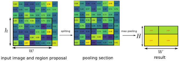 - feature map의 proposal region에서 미리 정해놓은 크기(FC layer의 인풋 사이즈)의 격자(grid)에 맞추어 bin마다 maxpooling 하여 고정된 크기의 vector를 만들어낸다.