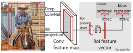RoI Pooling을 진행하여 고정된 크기의 feature vector를 얻는다.feature vector는 FC layer를 통과한 뒤, 구 브랜치로 나뉘게 된다.